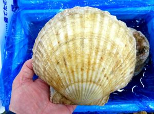このホタテガイは、天然モノ。通常地撒きでは、成貝になるまで3年かかり収獲されるそうです。
