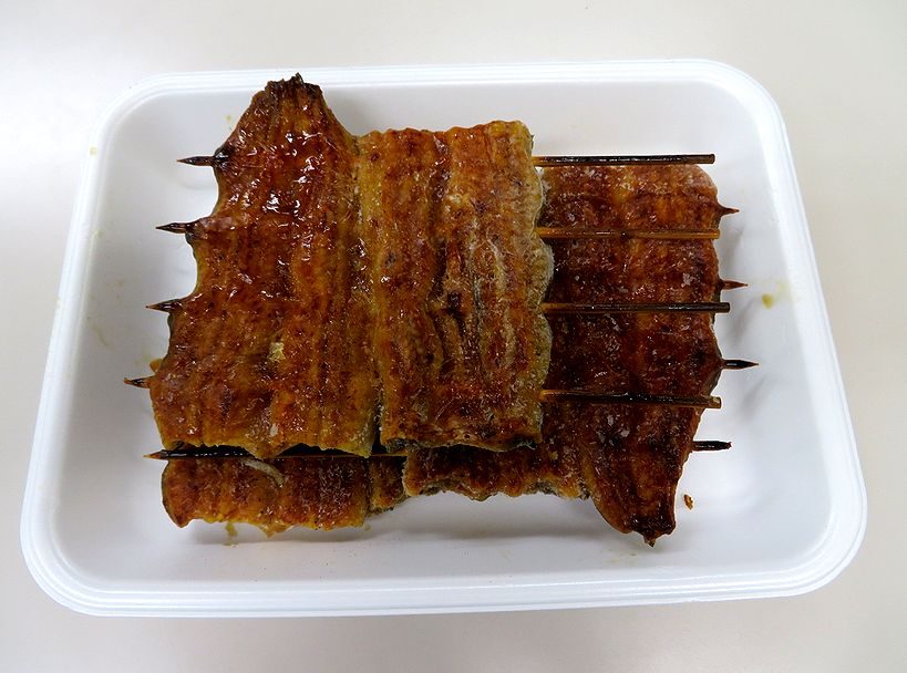 筆者もお店の陳列撮影に協力を頂いた㈲兼音青木商店で、新仔・串打蒲焼を買っちゃいました。