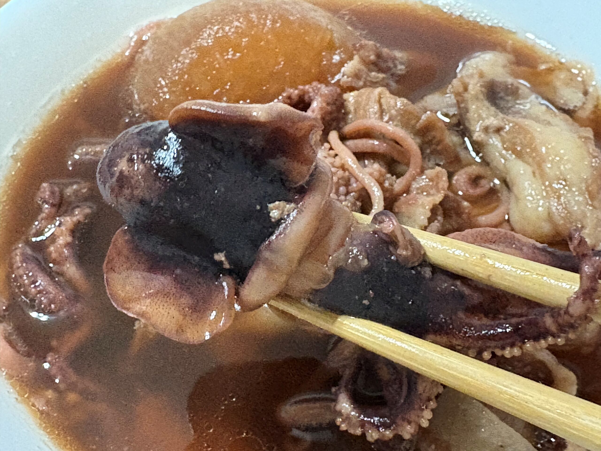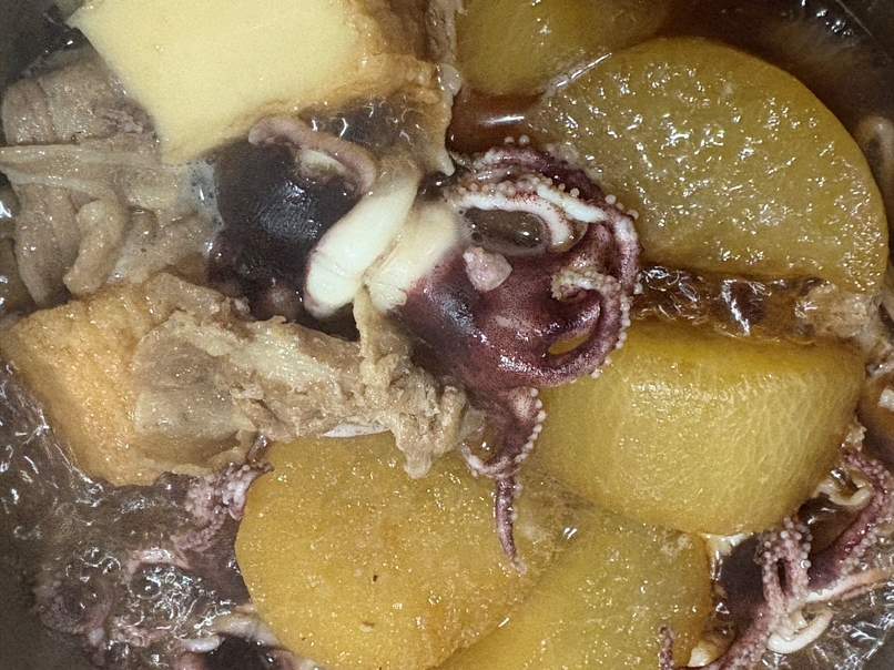 とりあえず塩ゆでし、今回も大根、豚バラ、厚揚げ、そしてミミイカを一緒に炊きました。