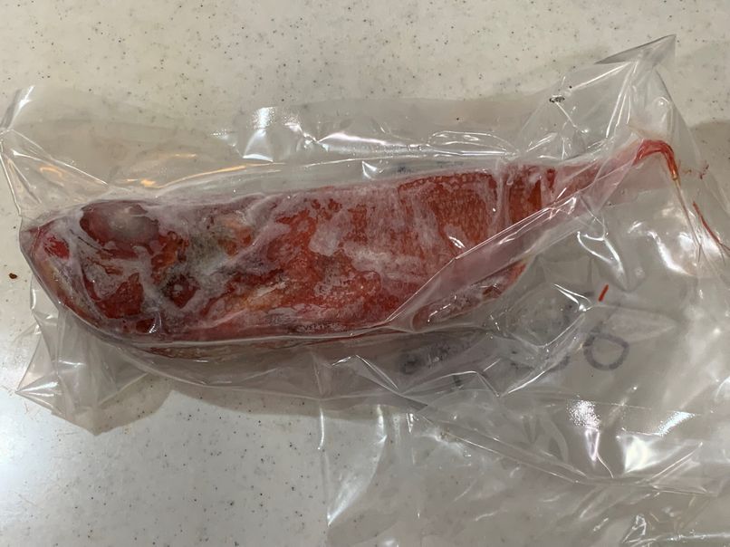 真空パックされた袋に鋏を入れると、えっ!?このキンメ脂がある。